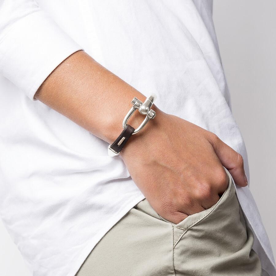 Casual and elegant bracelet in the shape of a shackle, made of a metal alloy and plated in silver with brown leather detail. Exclusive CXC design, handcrafted in Spain.