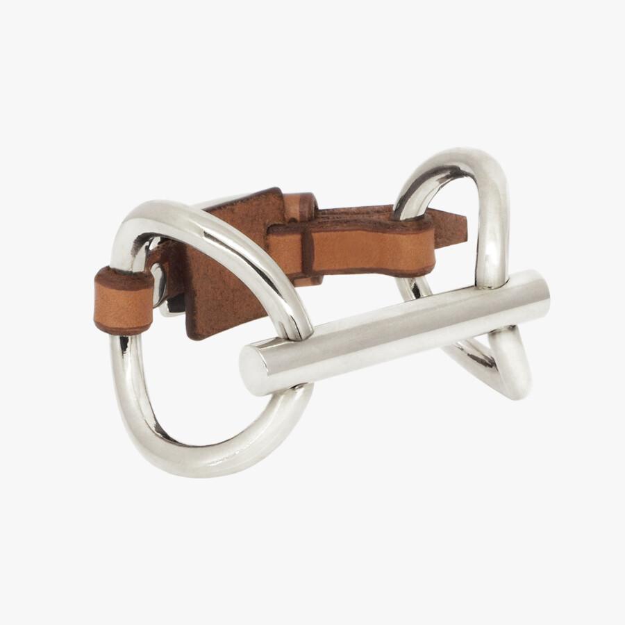 Another iconic piece of the brand is this exclusive equestrian-inspired bracelet in the shape of a bit, a mix of camel leather and a silver-plated metal alloy. Model also available in gold. Exclusive CXC design, handcrafted in Spain. In the form of a stylized bite adapted by the brand.
