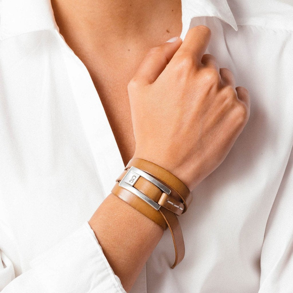 This camel-colored leather bracelet with an original clasp made of a two-piece metal alloy and plated in silver is a statement piece from the brand. Also available in gold. Exclusive CXC design, handcrafted in Spain.