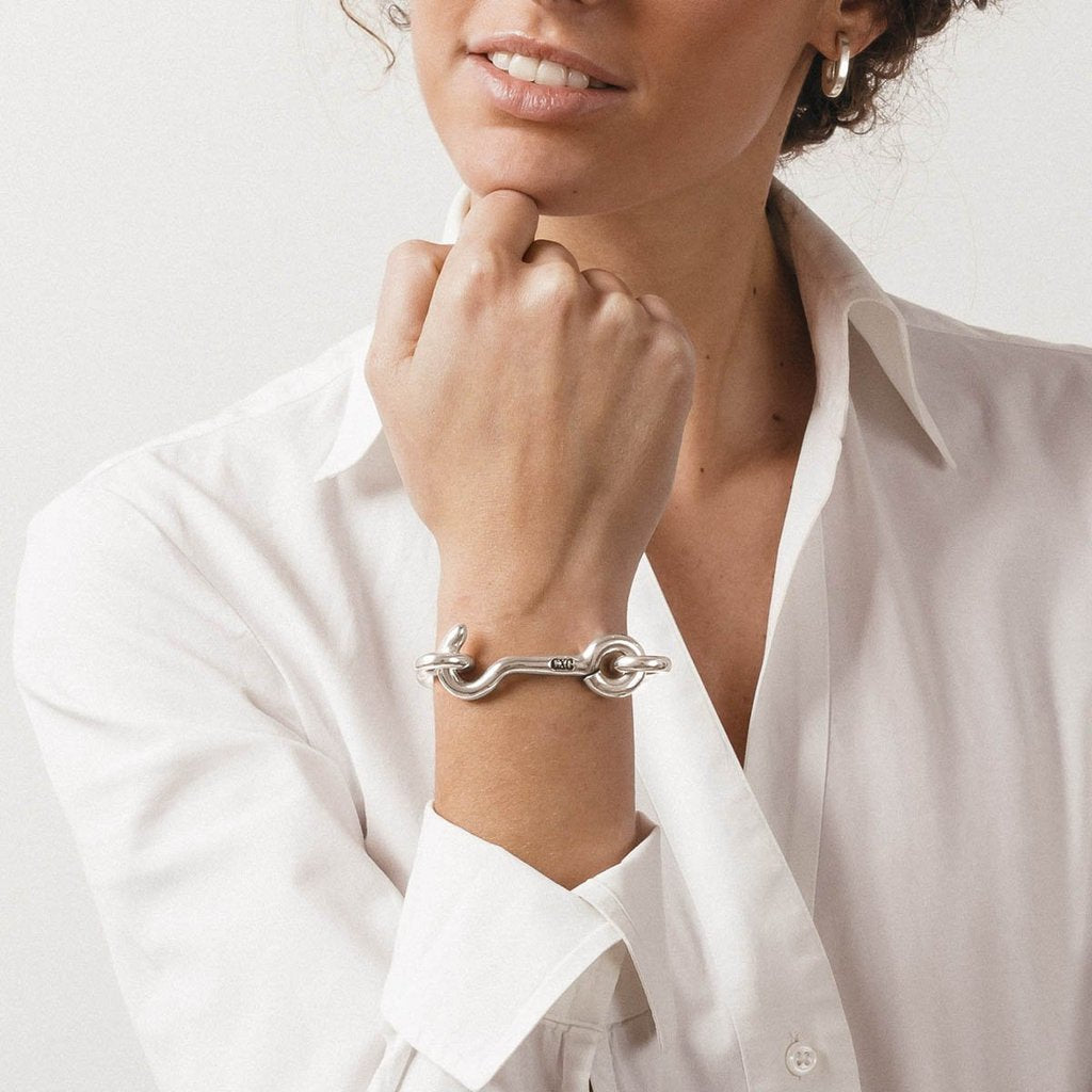 Bracelet with clear hardware inspiration, one of the hallmarks of CXC. The bracelet is made of metal alloys and plated in silver. Also available in gold. Exclusive CXC design, handcrafted in Spain.