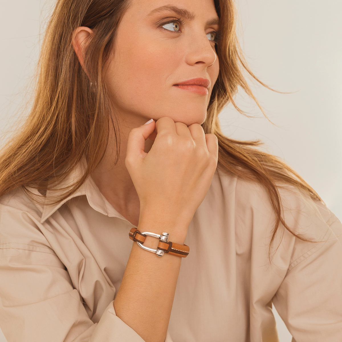 Bracelet with hand-sewn tubular camel leather and tinted edges.