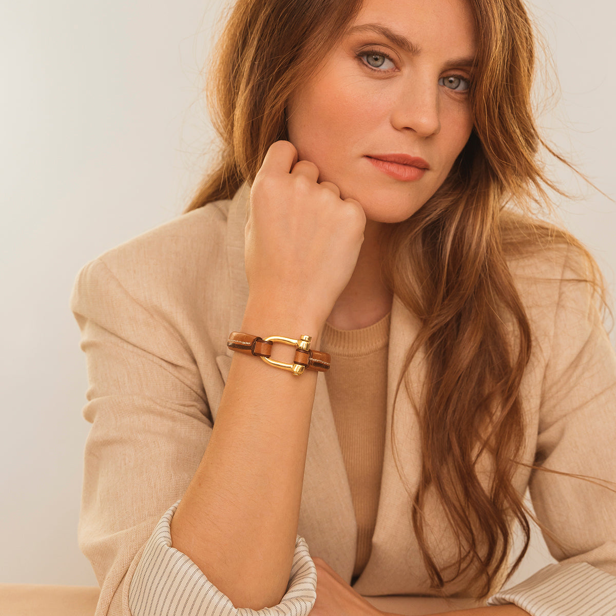 Bracelet with hand-sewn tubular camel leather and tinted edges.