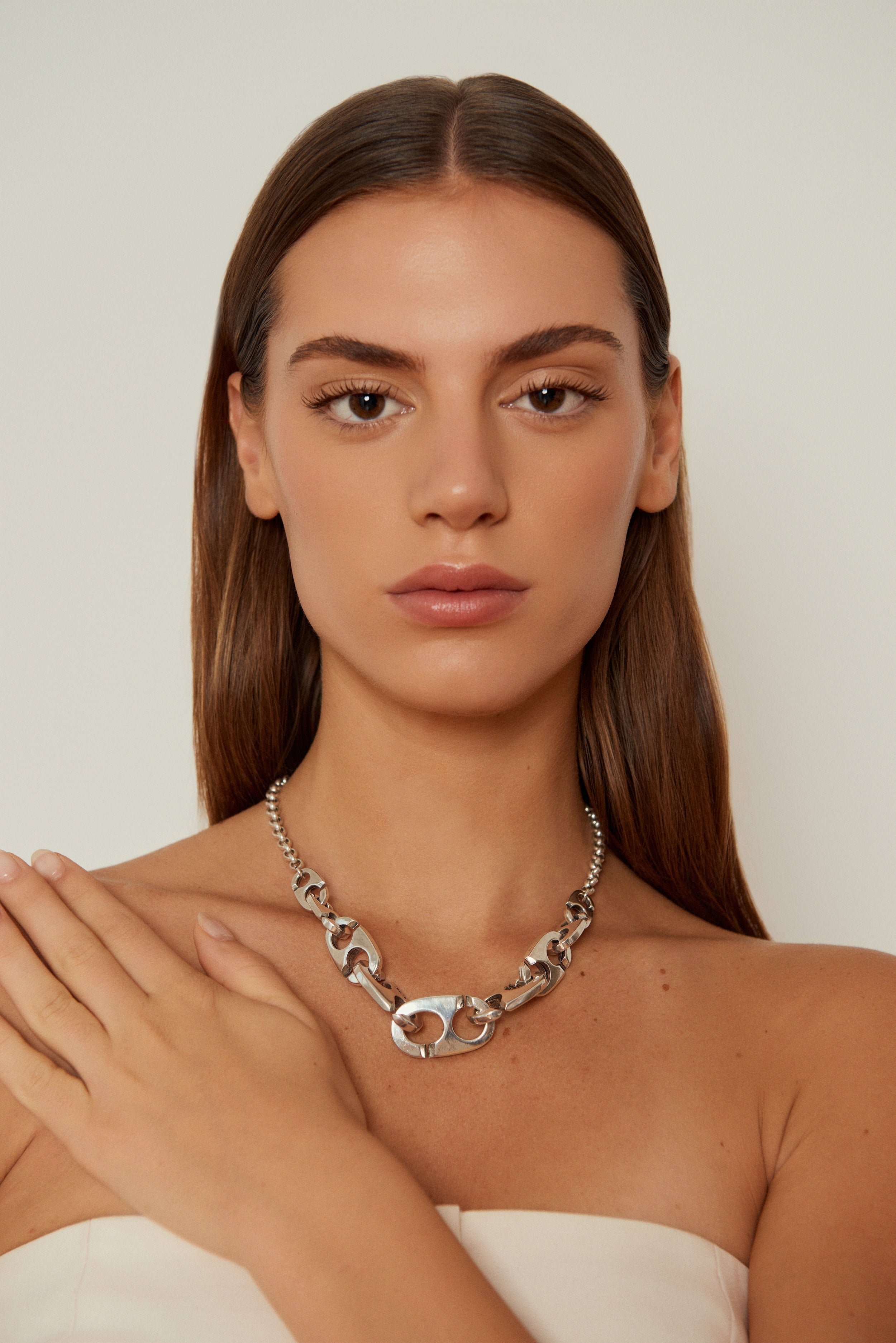 Materiales: Aleación de zinc y otros metales, cadena de latón, bañados en plata