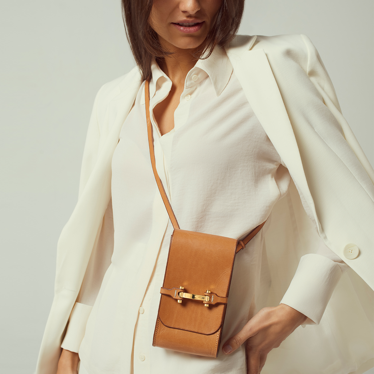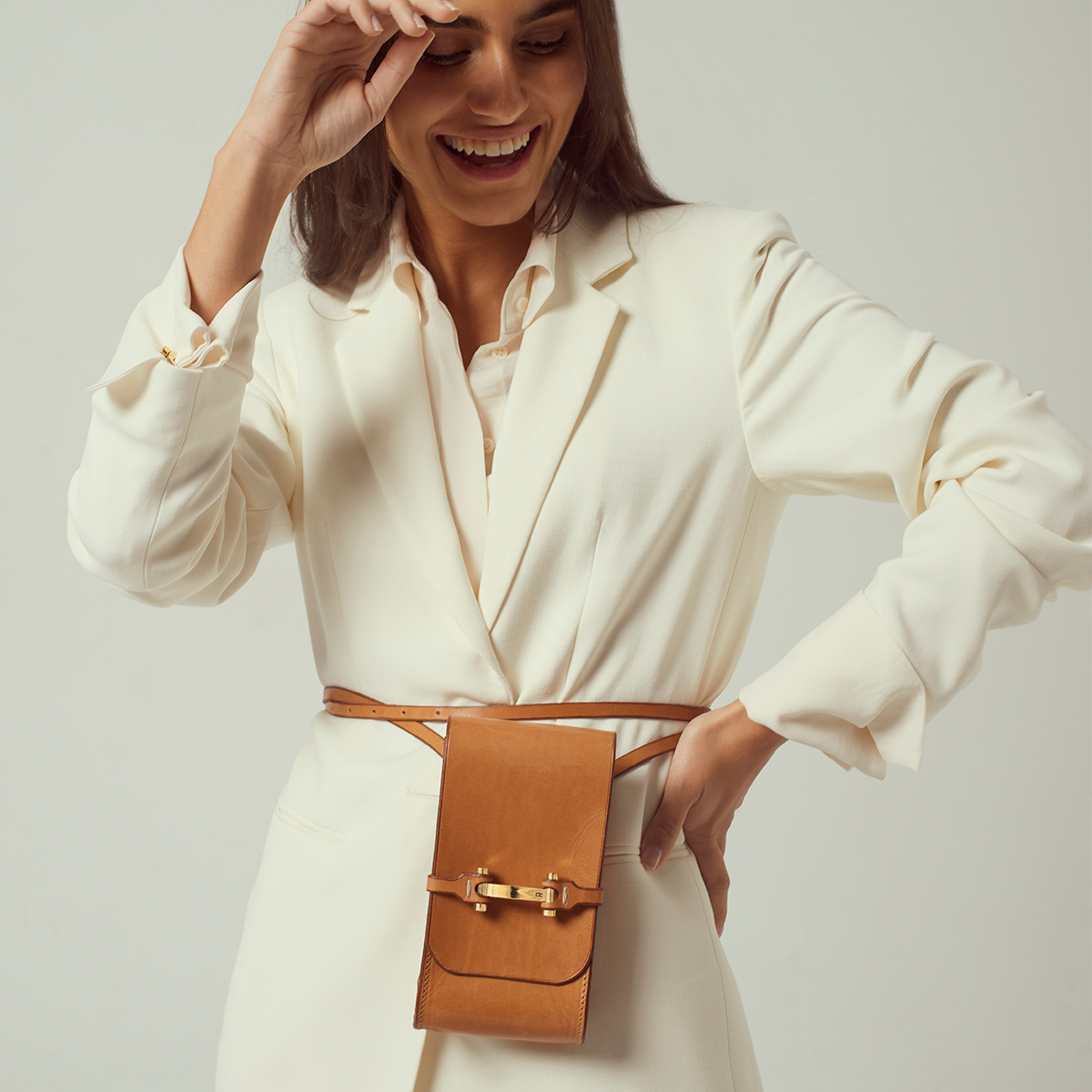 Bolsito de cuero de curtición vegetal de color camel con herraje en forma de "H" en Oro.