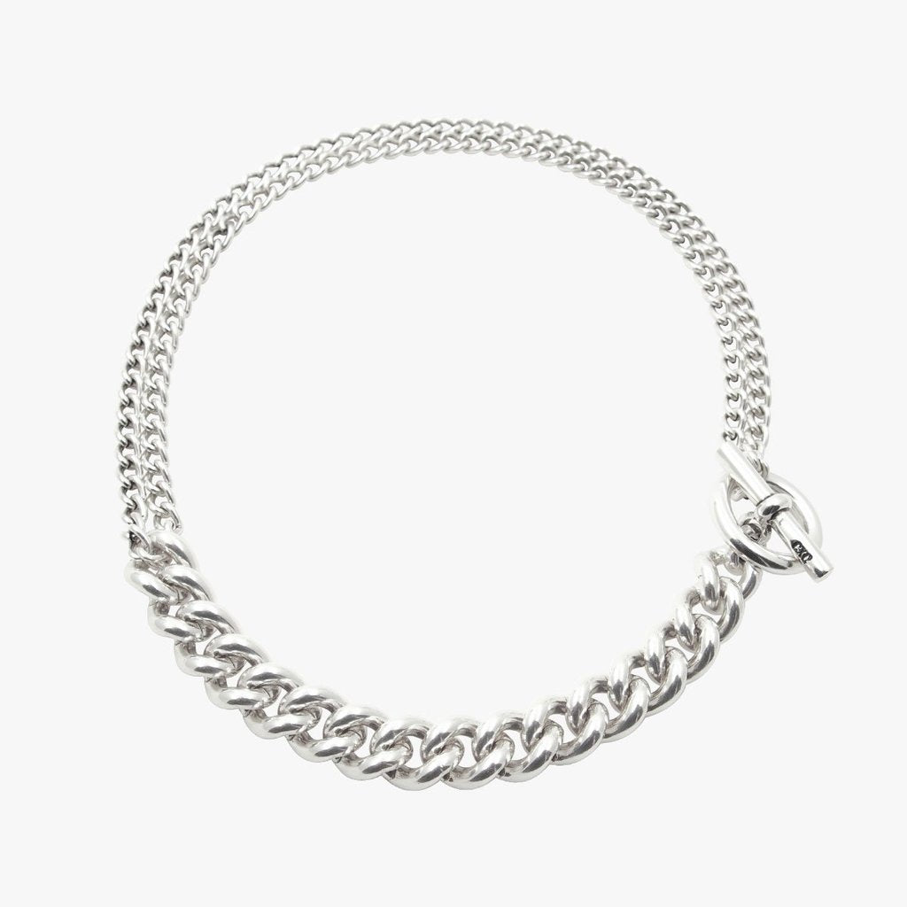 Short necklace composed of links and a thin silver-plated chain finished with the most characteristic closure of our brand. Exclusive CXC design, handcrafted in Spain.