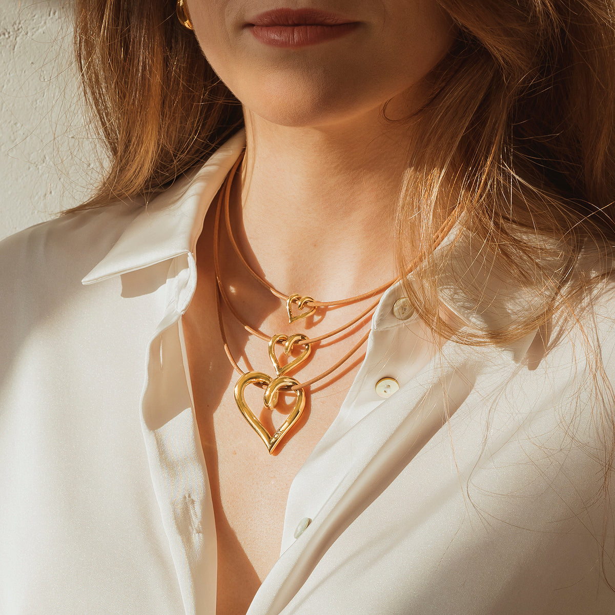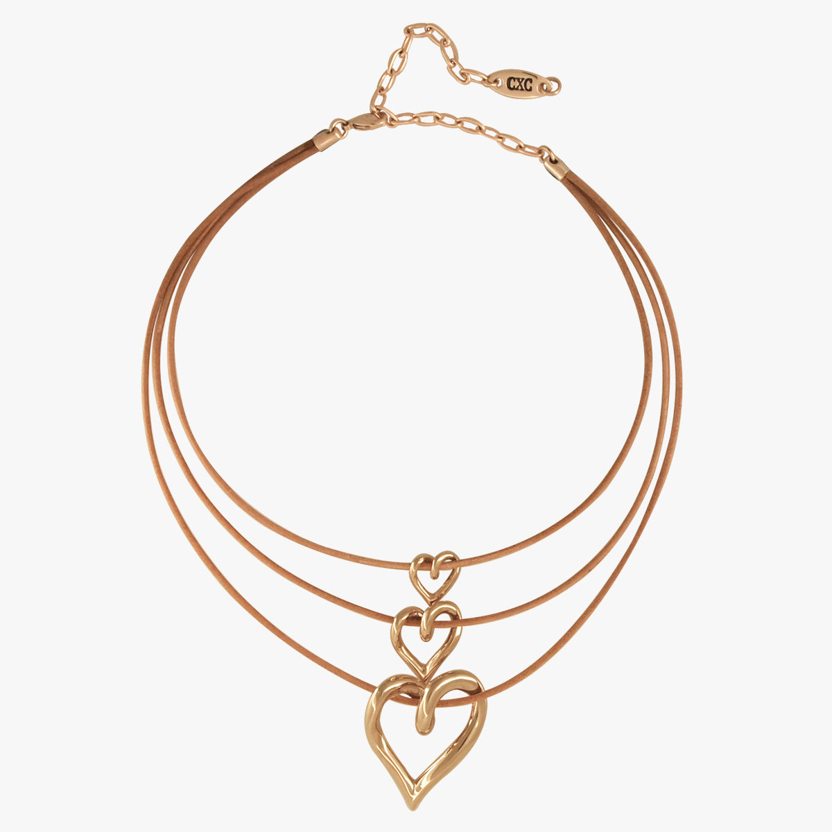 Necklace with three 1.6 mm leather strands at lengths of 34, 38 and 41 cm, with terminals and a 10 cm gold-plated extender chain. The hearts are gold-plated.