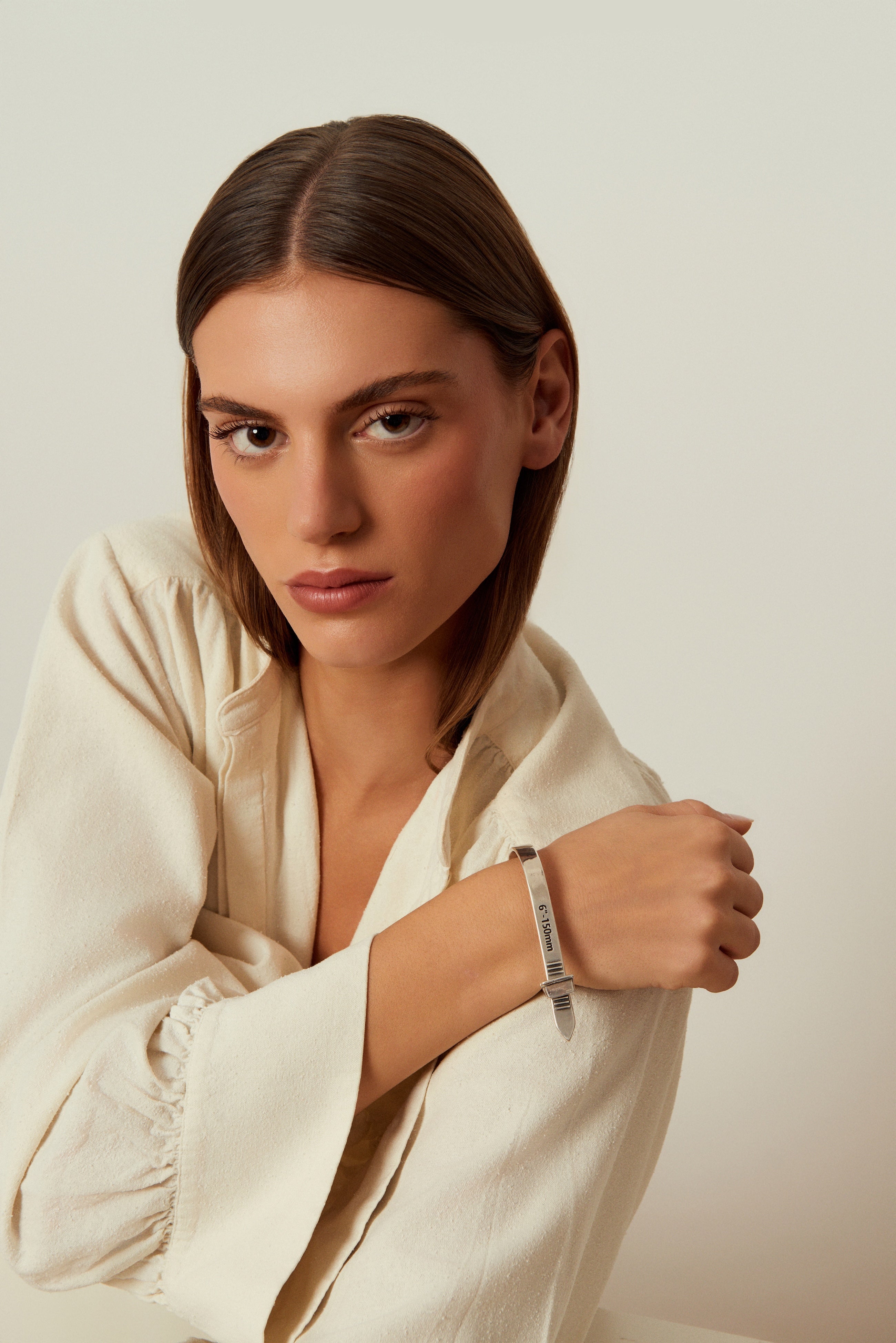 Pulsera Brida, un guiño al herraje industrial convertido en pulsera minimalista de metal pulido, perfecta para dar actitud a cualquier look.