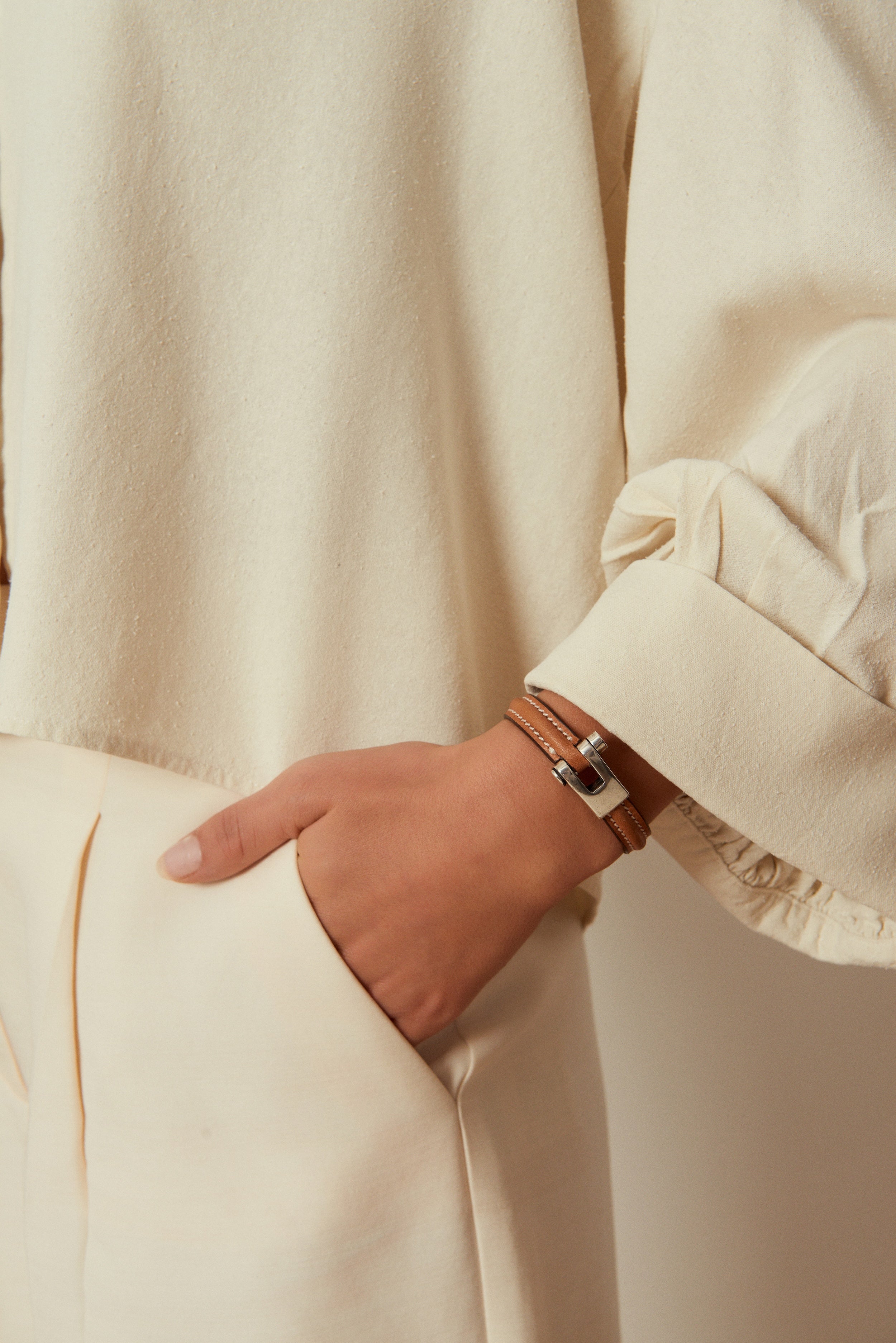 Materiales: Aleación de Zinc y otros metales, cuero color camel, bañada en plata.