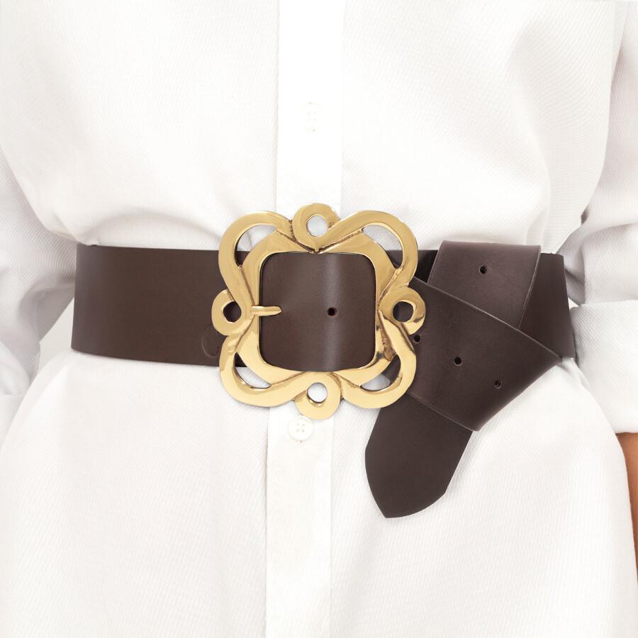 Classic brown leather belt with a large square buckle. The leather is vegetable tanned with polished and hand-cut edges. Exclusive CXC design, handcrafted in Spain.