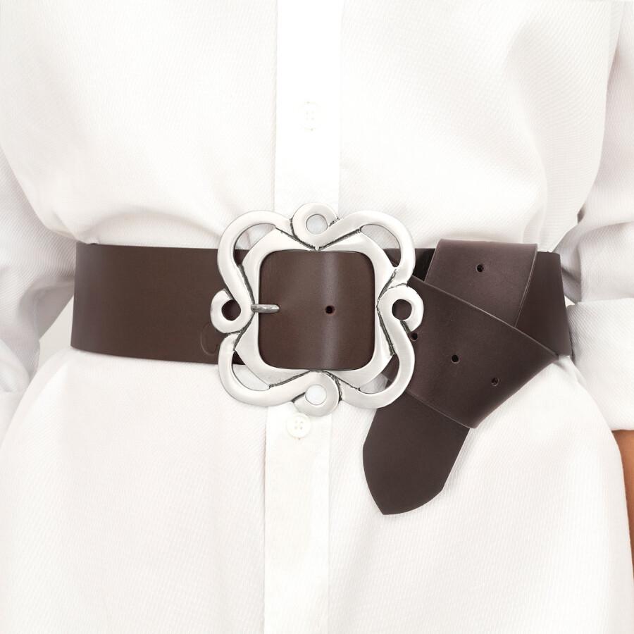 Classic brown leather belt with a large square buckle. The leather is vegetable tanned with polished and hand-cut edges. Exclusive CXC design, handcrafted in Spain.
