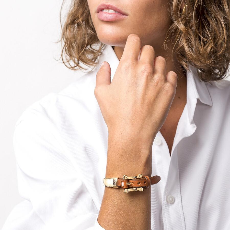 Esta pulsera con hebilla, característica de la marca, es una pieza básica ideal para el día. El modelo está fabricado con una aleación de metales y bañado en oro. También disponible en plata. Diseño exclusivo de CXC, elaborado de manera artesanal en España.