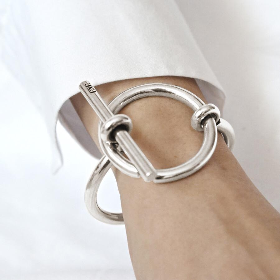 Una de las piezas más lujosas e icónicas de la firma es este brazalete de latón con baño de plata y cierre en forma de T. Diseño exclusivo de CXC, elaborado de manera artesanal en España.