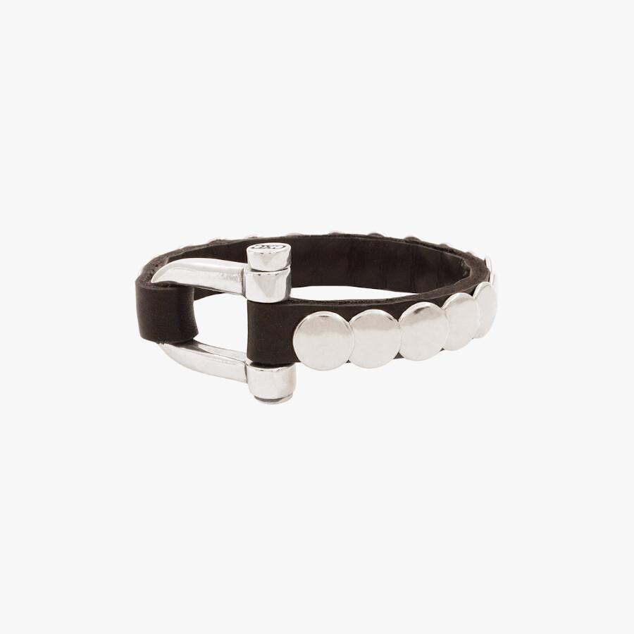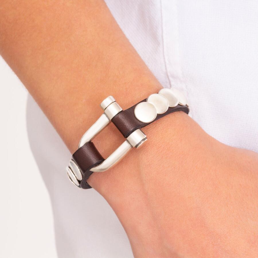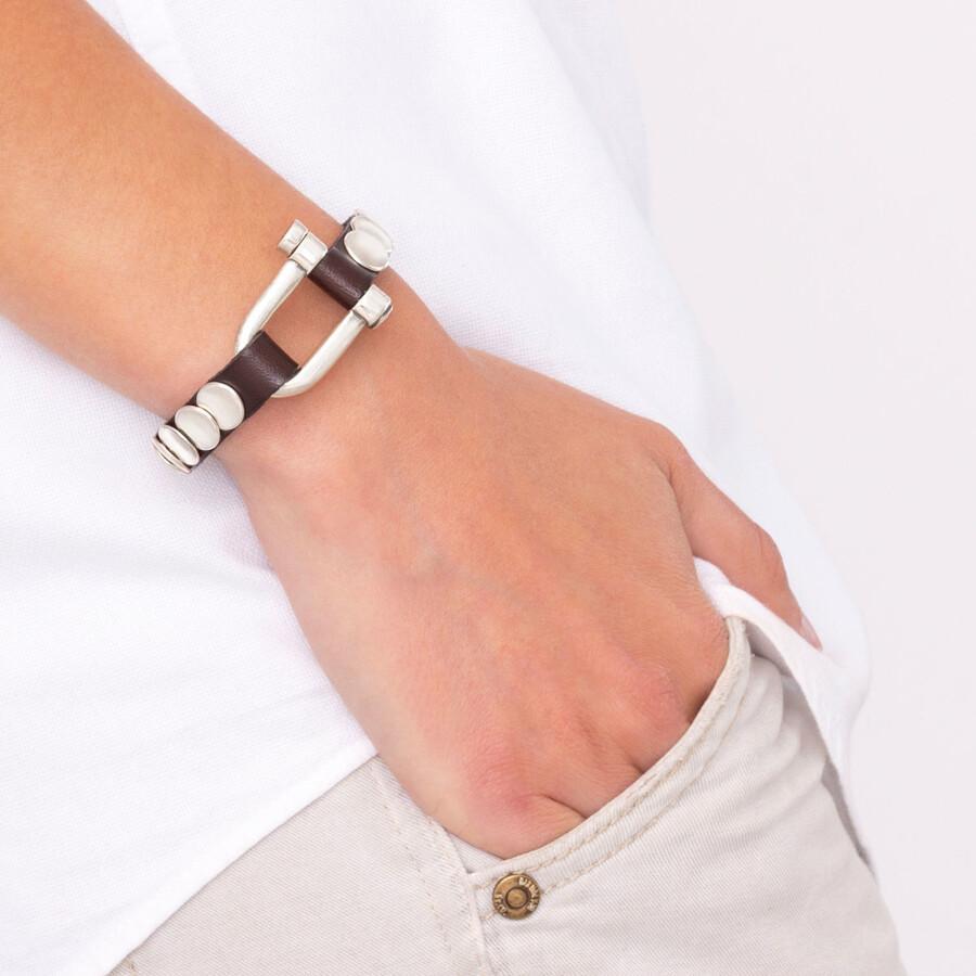 Un clásico de CXC se reinventa. Esta pulsera con banda delgada de cuero marrón y remaches de latón bañados en plata le darán un toque desenfadado a cualquier look. Modelo también disponible en camel. Diseño exclusivo de CXC, elaborado de manera artesanal en España.