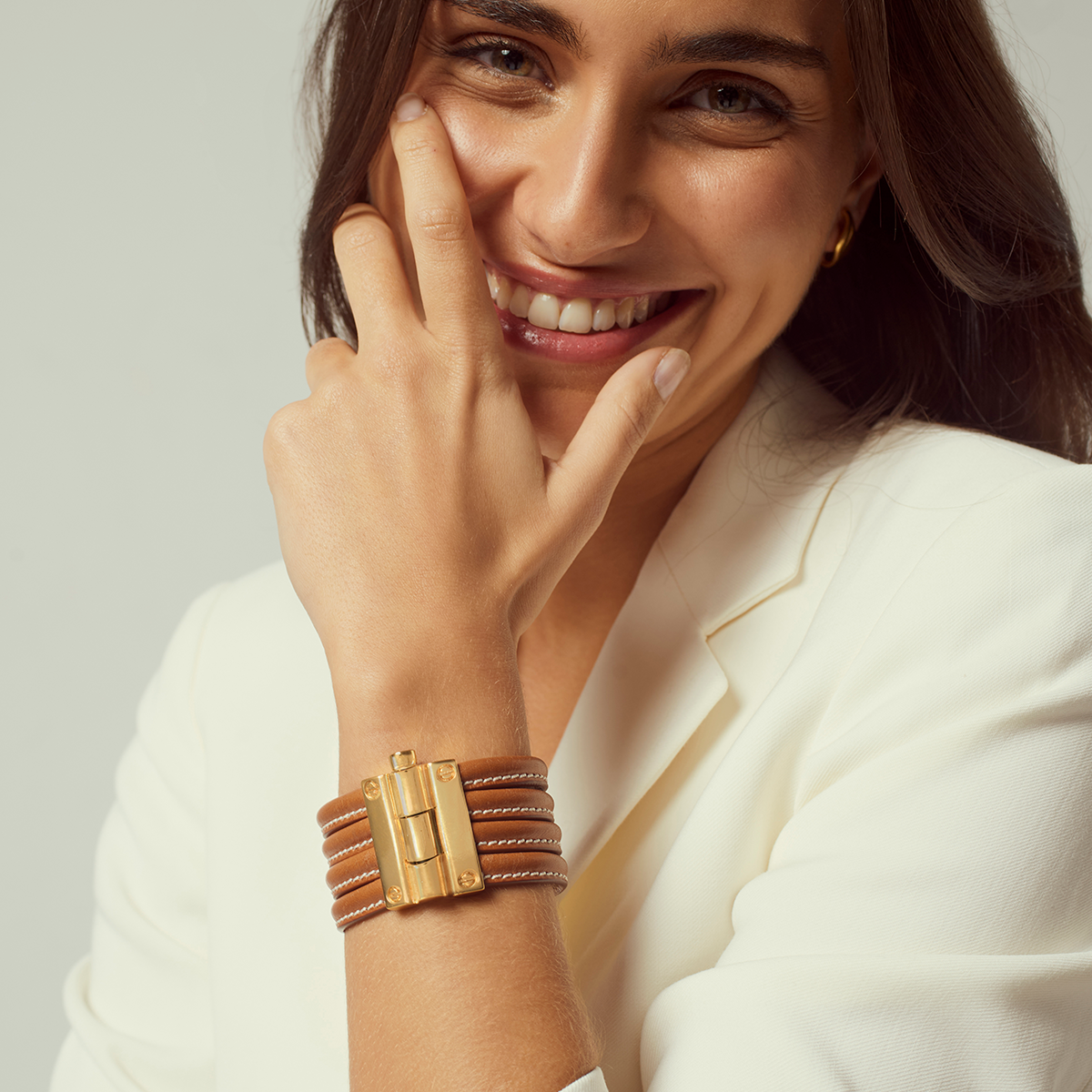 Pulsera formada por 4 cordones de cuero tubular con el canto matado, tañido y lujado.