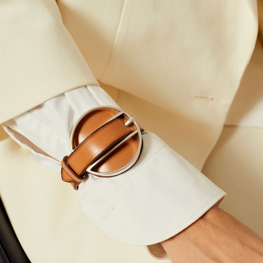 Pulsera con Cuero Camel, con canto matado a mano, teñido y lujado con fileteado. Hebillla bañada en Plata.