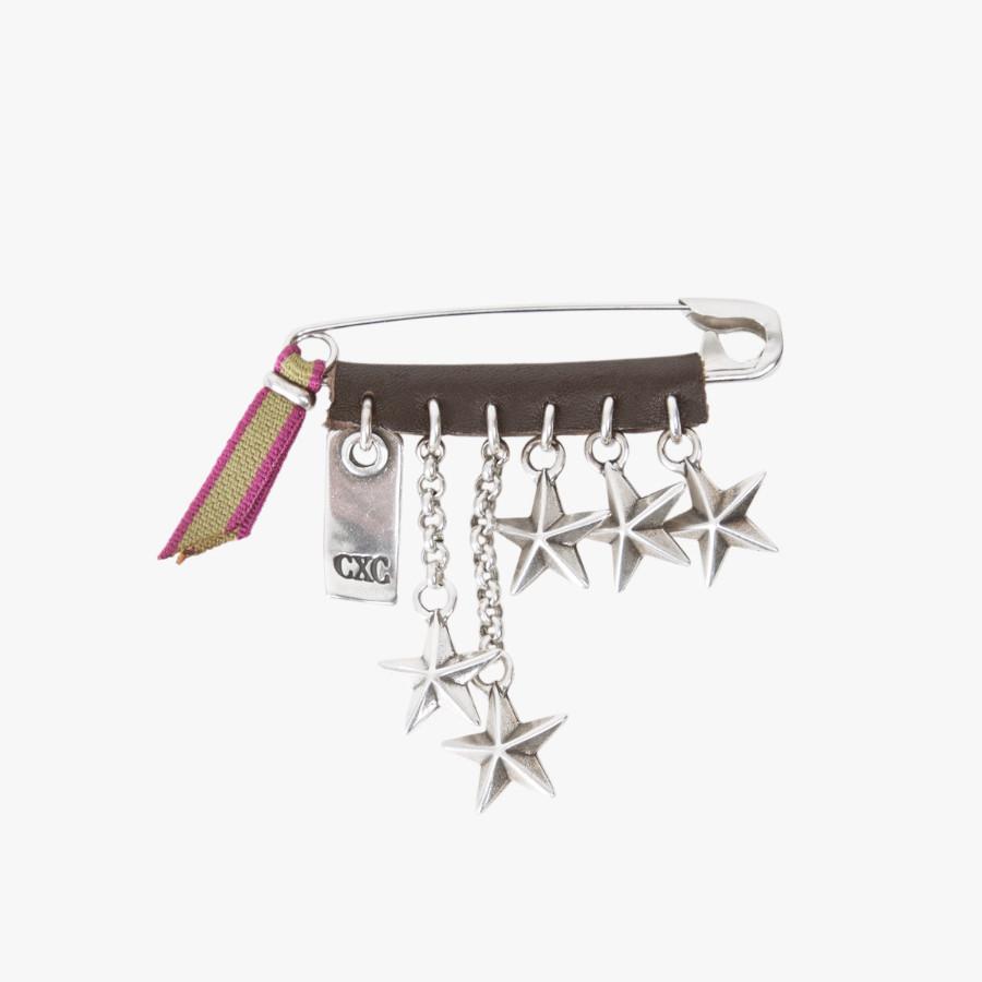 Broche característico de la firma bañado en plata y elaborado con cuero marrón. Diseño exclusivo de CXC, elaborado de manera artesanal en España.