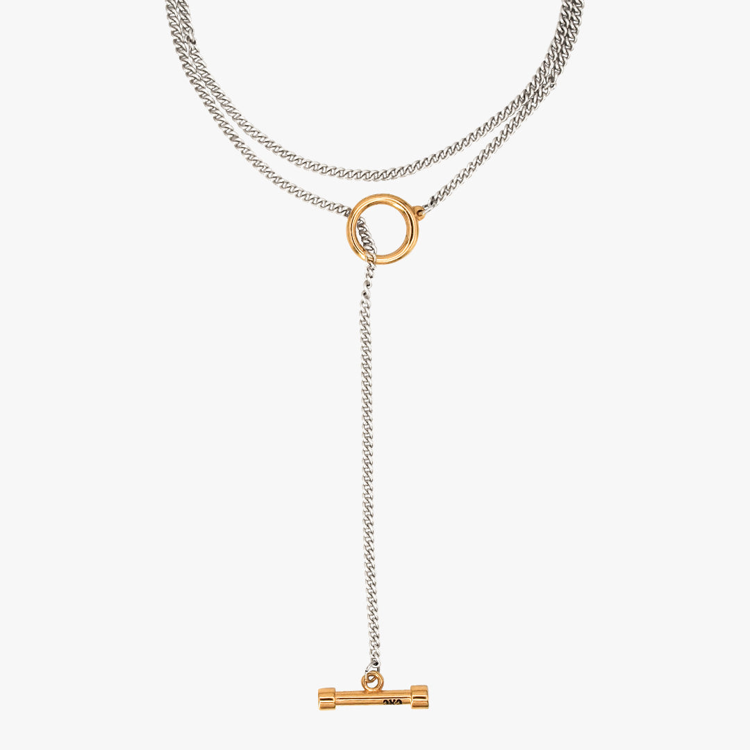 Materiales: Aleación de zinc y otros metales, cadena de latón, bañados en plata y oro. Medidas: