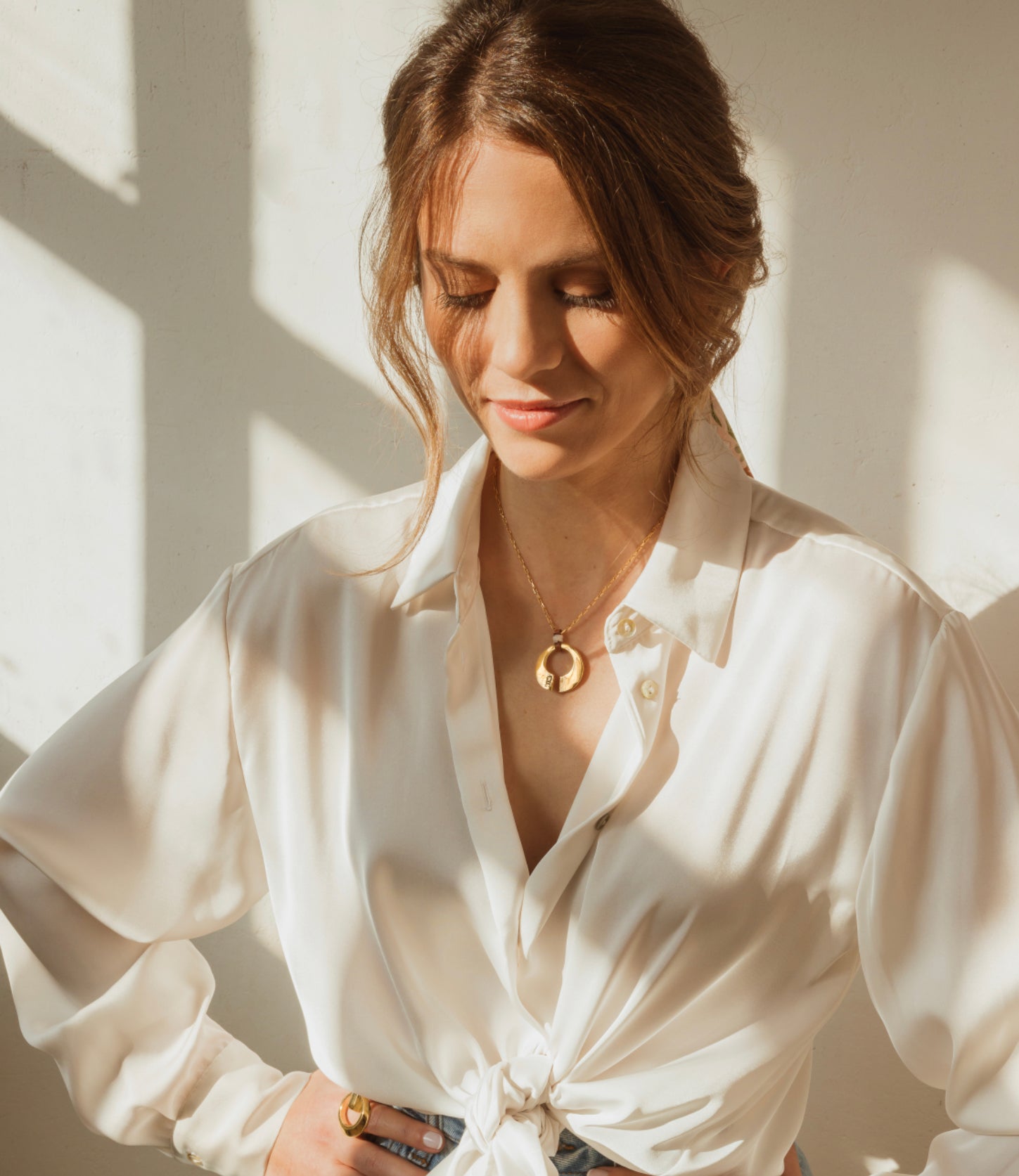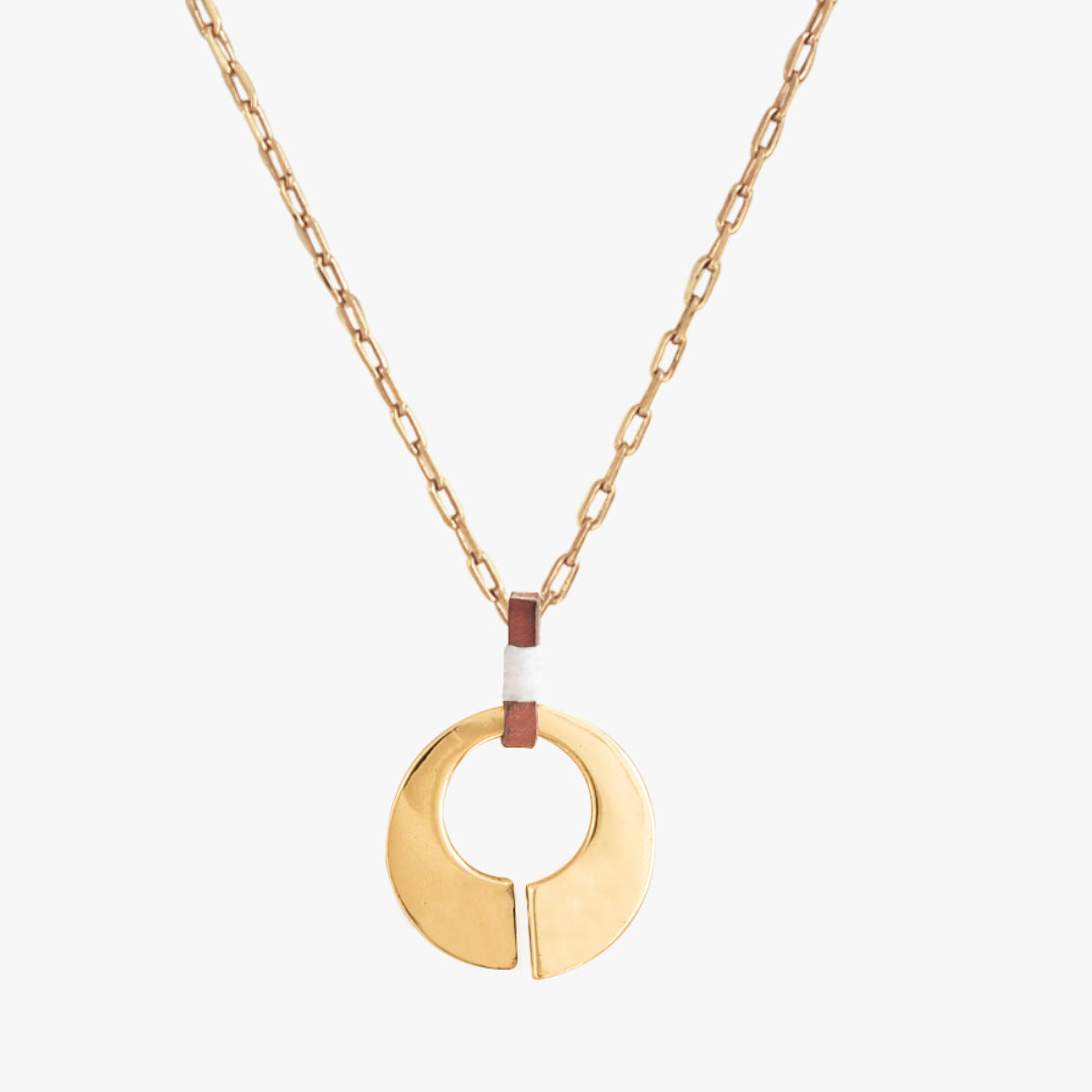 El motivo va unido a la cadena mediante una tira de cuero cosido a mano.