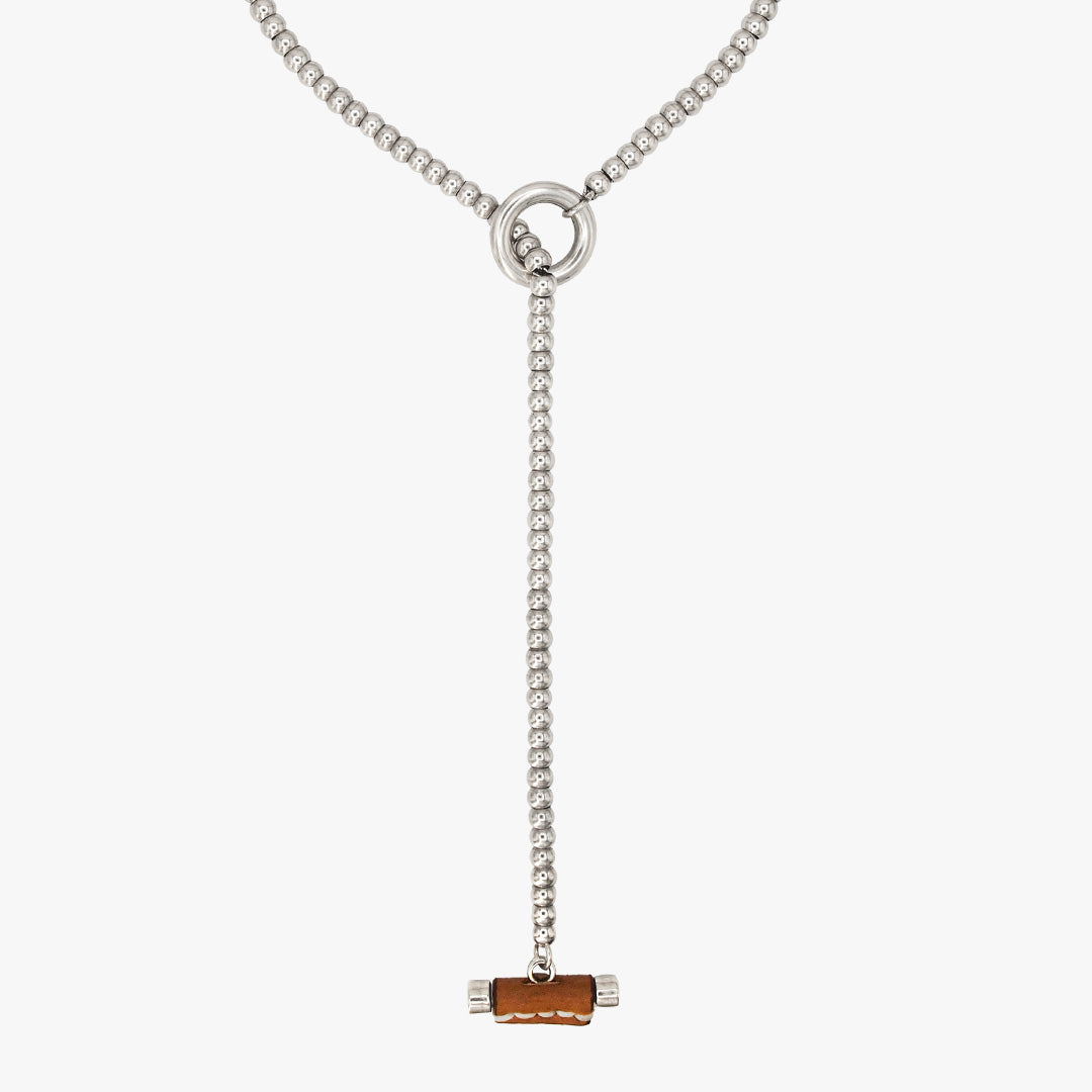Materiales: Aleación de zinc y otros metales, cadena de latón, cuero color camel, bañados en plata.