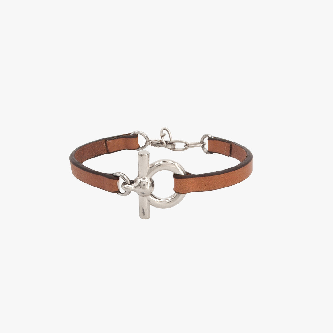 Materiales: Aleación de zinc y otros metales, cuero color camel, bañada en plata