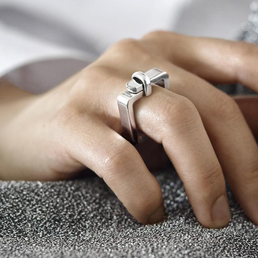 Para quienes quieren romper la tradición, este anillo con cuerpo cuadrado fabricado en latón y bañado en plata es ideal. La pieza se abre y se cierra permitiendo adaptarlo a una talla menos. Modelo también disponible en oro. Diseño exclusivo de CXC, elaborado de manera artesanal en España.